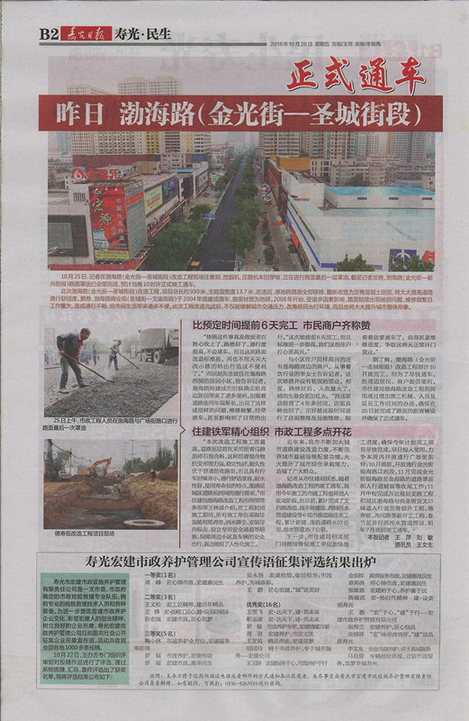 由我公司承建的渤海路改造工程于2018年10月25日晚22點通車 (本文來自于壽光日報、壽光網(wǎng))