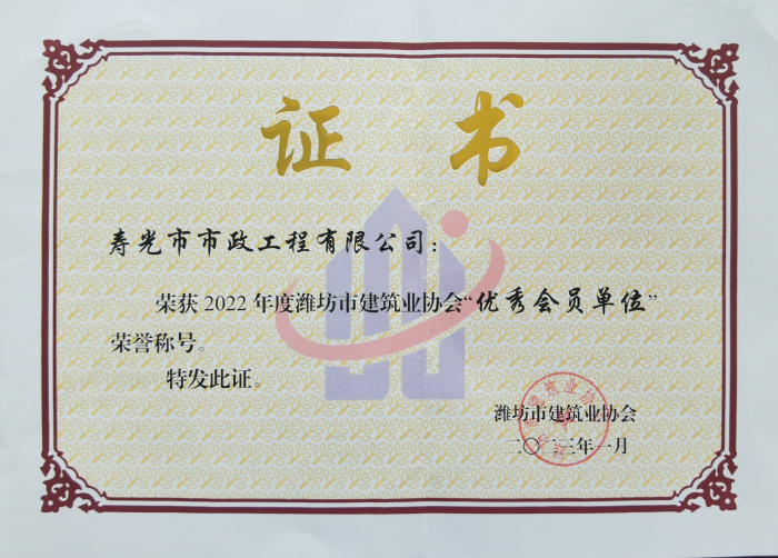 近日,濰坊市建筑業(yè)協(xié)會(huì)下發(fā)文件,公布了2022年度濰坊市建筑業(yè)協(xié)會(huì)優(yōu) 秀會(huì)員單位名單,我單位位列其中。此榮譽(yù)的獲得,充分體現(xiàn)了公司在我市建筑業(yè)的綜合競(jìng)爭(zhēng)優(yōu)勢(shì),彰顯了行業(yè)地位,是對(duì)公司從業(yè)人員素質(zhì)、工程質(zhì)量和企業(yè)管理水平等工作的肯定和認(rèn)可。